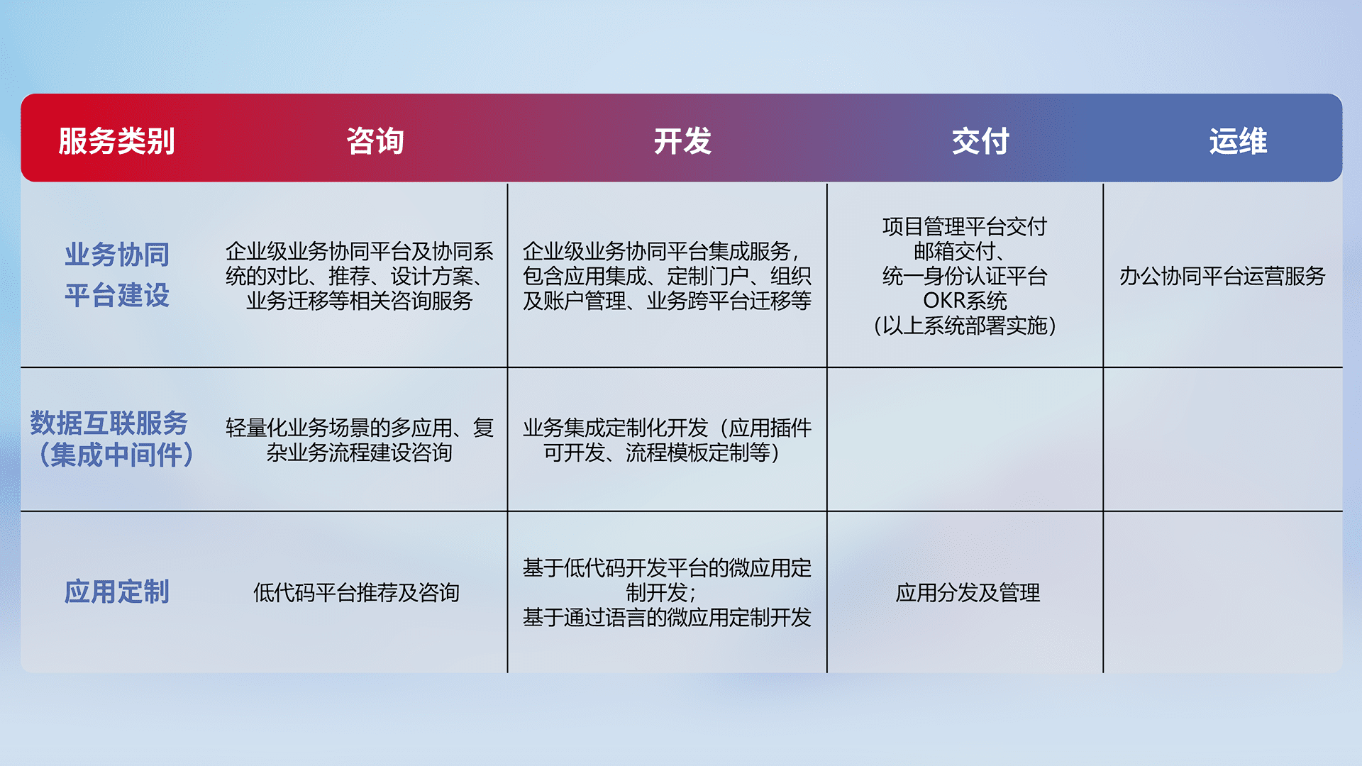 针对钉钉、、、、企微、、、IDaas等平台级产品提供产品的规划、、、方案、、、、交付、、、、定制化开发等服务,,实现如统一协同办公、、智能客户服务、、、、混合会议管理、、、、智能数据查询、、、、等业务场景,,,实现数字化转型。。。