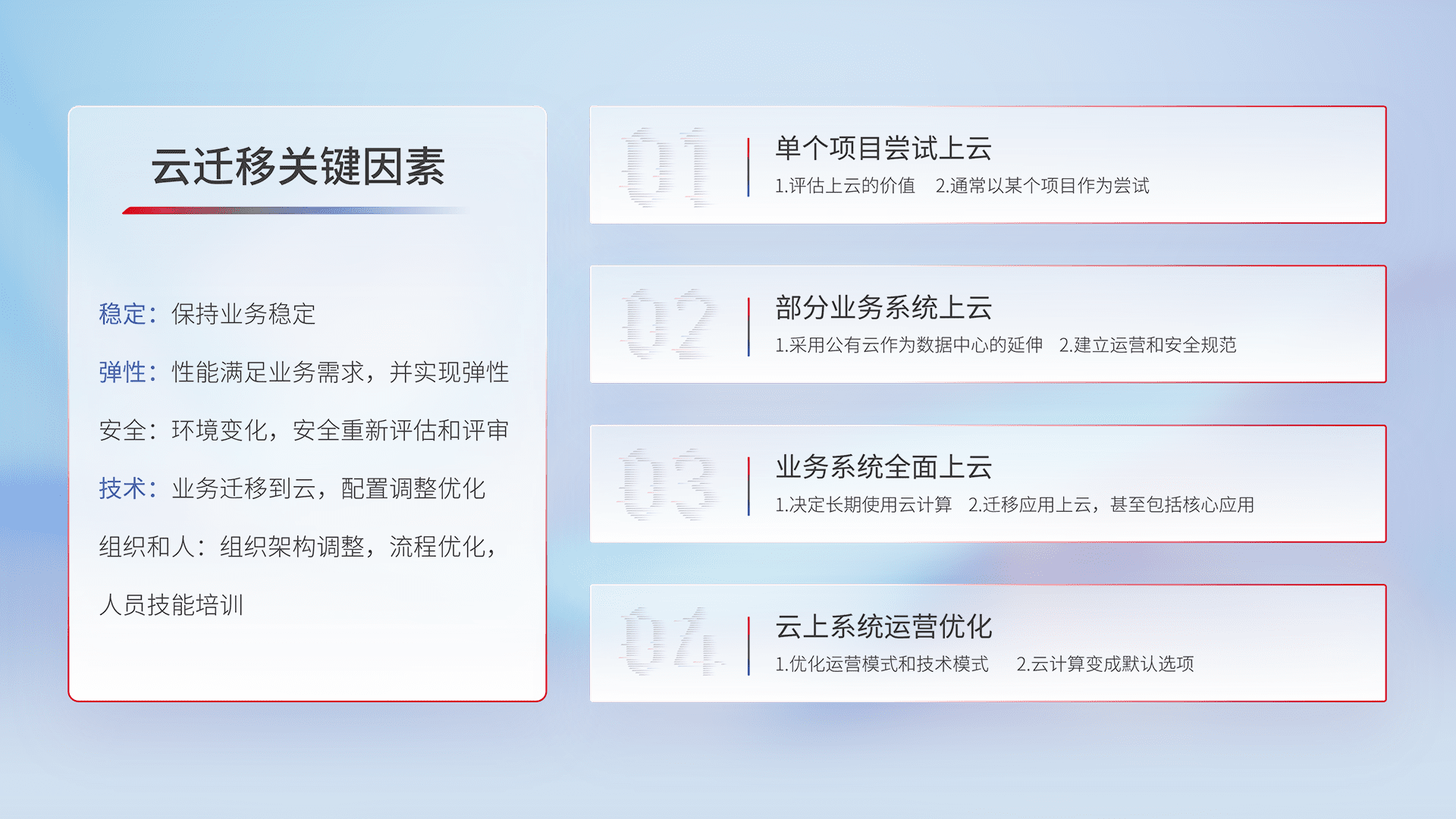 结合实际业务,,,从规划设计、、、云平台选型、、云原生改造、、数据迁移、、、集成交付,,迁移全过程为客户识别最佳上云路径,,做好风险识别管理,,,设计网络架构、、、、身份权限、、、安全审计合规、、操作审计、、、日志审计、、、、监控告警策略、、多站点容灾设计等,,,对云上基础设施进行整体规划,,提升IT治理水平,,,以满足弹性、、、高可用、、高性能的需求。。