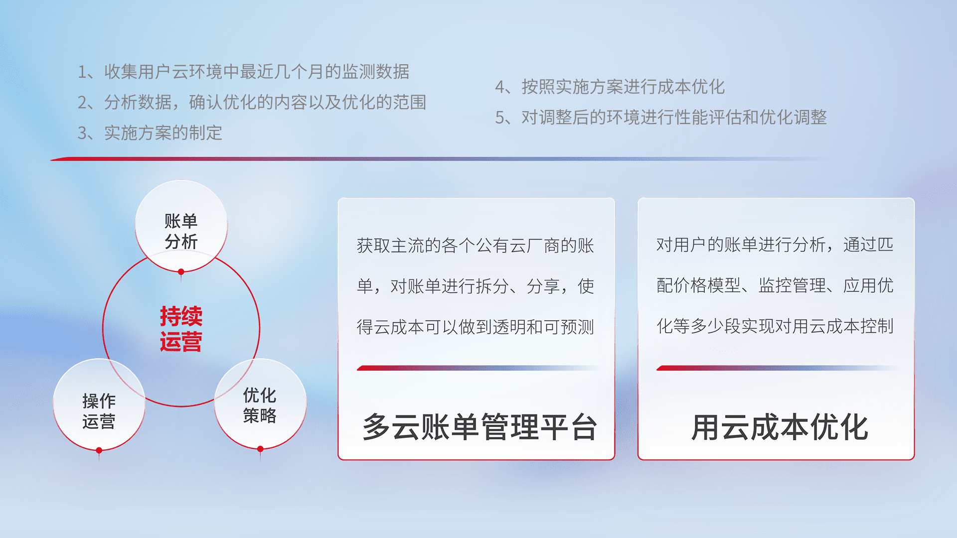 通过多云纳管,,以统一的资源数据模型把客户的云资源进行抽象和封装,,,进而实现对多云资源的统一操作,,保障云资源管理的可靠性、、、、稳定性与可用性。。。。量身定制化运维内容,,配置、、、开发运维、、、、补丁管理、、备份、、、、监控、、、、认证和访问管理、、审计和日常巡检等,,,保障在用云过程中的可靠度,,,,稳定度以及高可用率。。